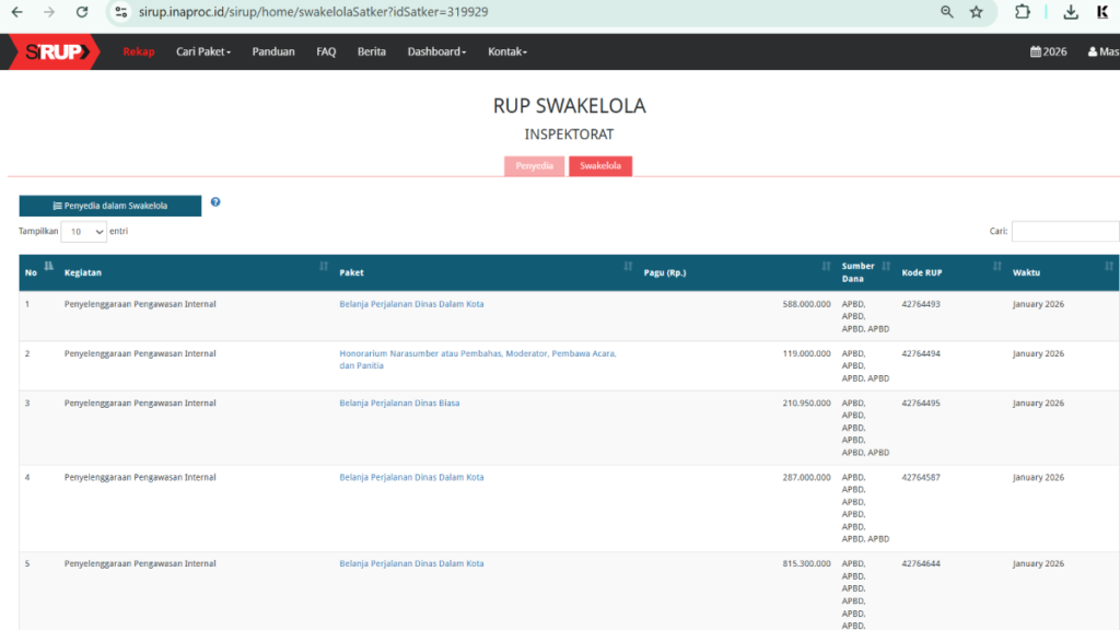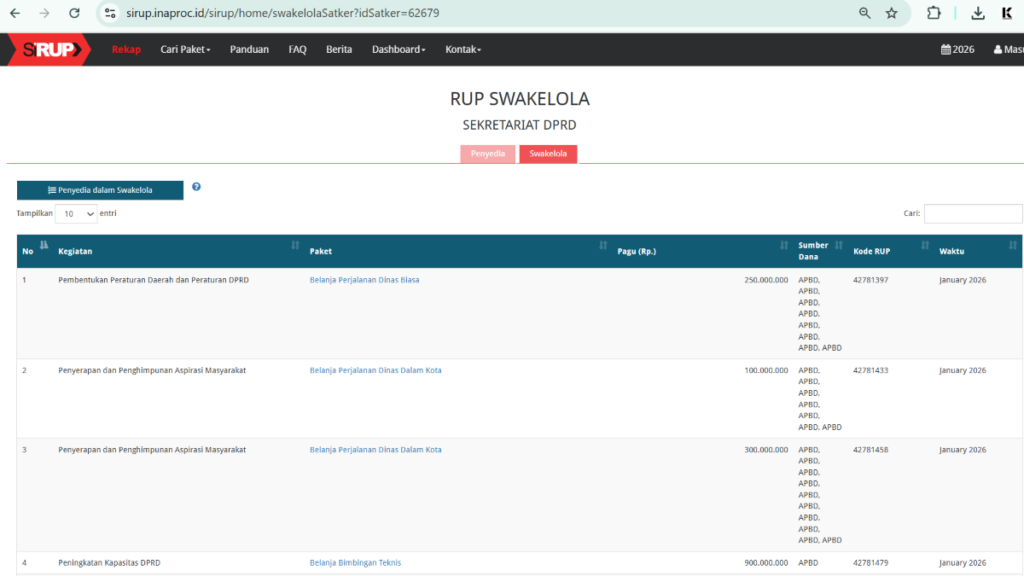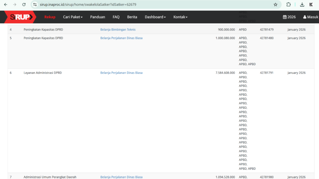 Rinciannya terdiri dari 15 paket, naik dari 8 paket pada 2025. Semua berstatus swakelola tanpa keterangan tujuan kegiatan yang spesifik.