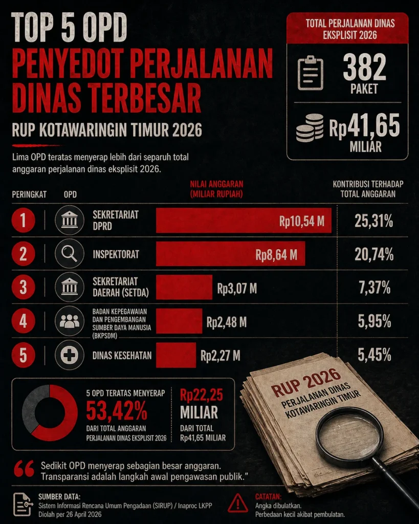 Gabungan kedua OPD ini menembus angka Rp19,18 miliar. Nilai tersebut menguasai hampir separuh dari seluruh kue anggaran perjalanan dinas eksplisit 2026.